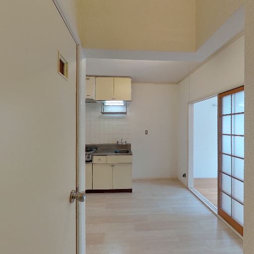 居室との仕切り(確度83%):キッチンと居室は半透明の引き戸で区切られ、奥の居室に窓とエアコンが見える。