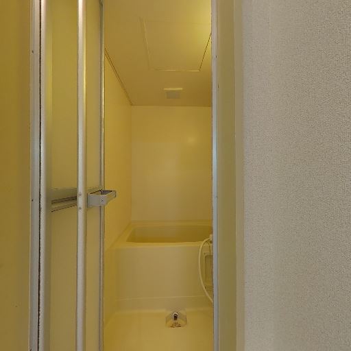 浴室はユニットでコンパクト(確度82%):引き戸の先に小型の浴槽とユニットバスが見える。