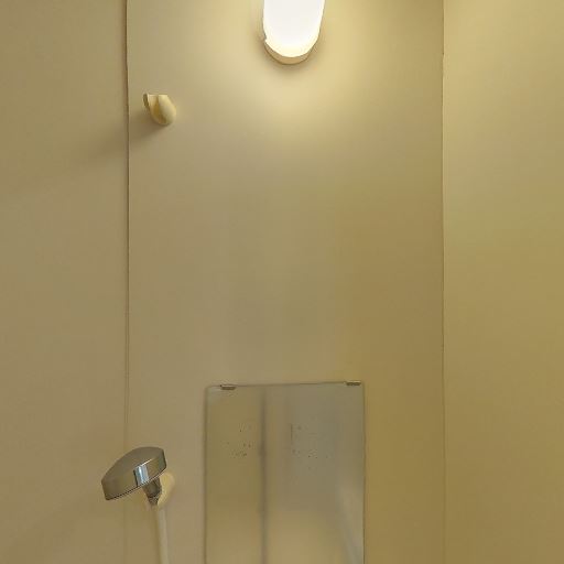 照明はやや簡素(確度78%):浴室内に小型の壁付け照明が1灯のみ見える。