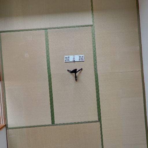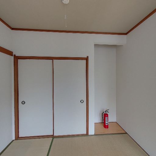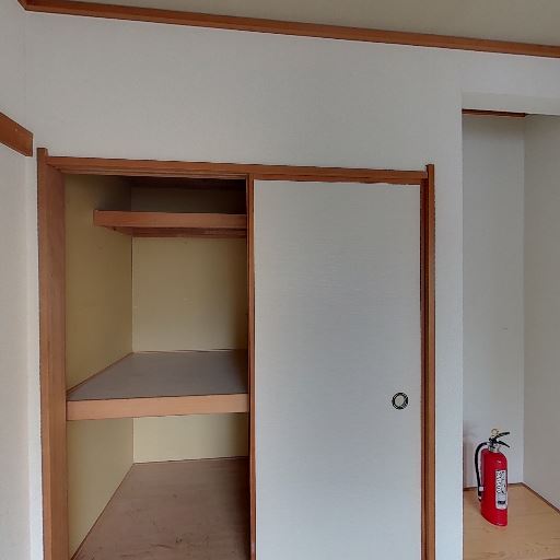 収納と床の間風スペース(確度78%):ふすまの収納に加えて右側に小さな床の間風の凹みがあり、消火器が置かれている。