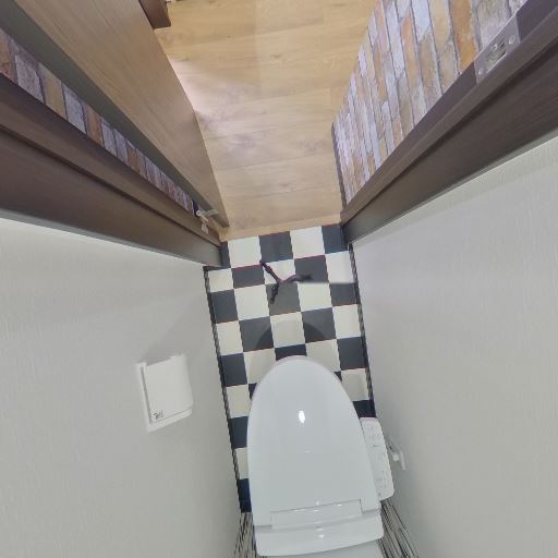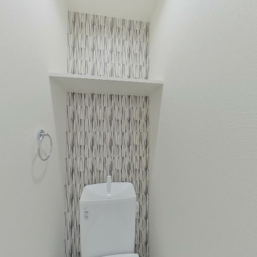トイレ室内のデザイン性(確度83%):背面アクセントクロスとニッチ棚、チェック柄の床で意匠性が高い。壁や便器も清潔に見える。