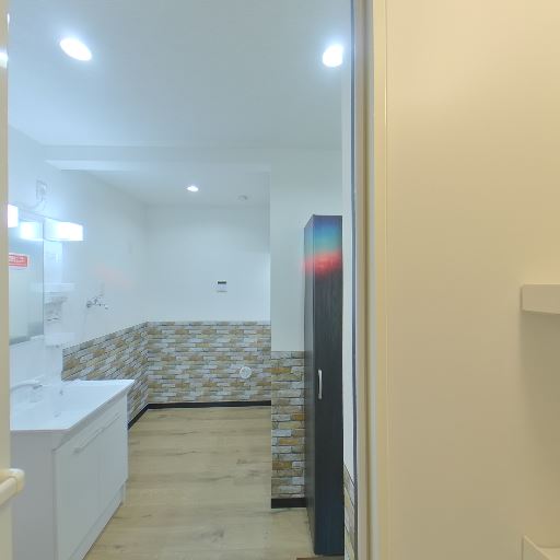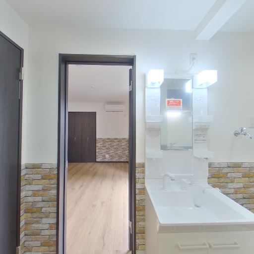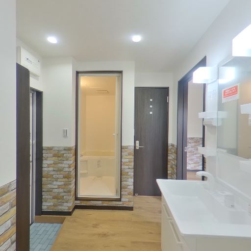 浴室が近接(確度78%):洗面・脱衣スペースの正面に浴室入口が見える。