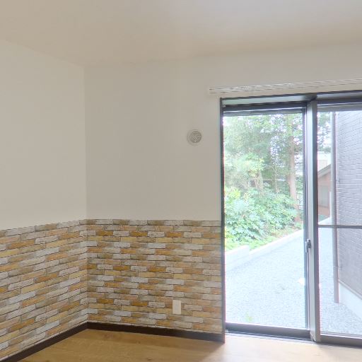 内装のアクセント壁(確度77%):腰高までレンガ調のアクセントクロスが張られており、視覚的なポイントになっている。