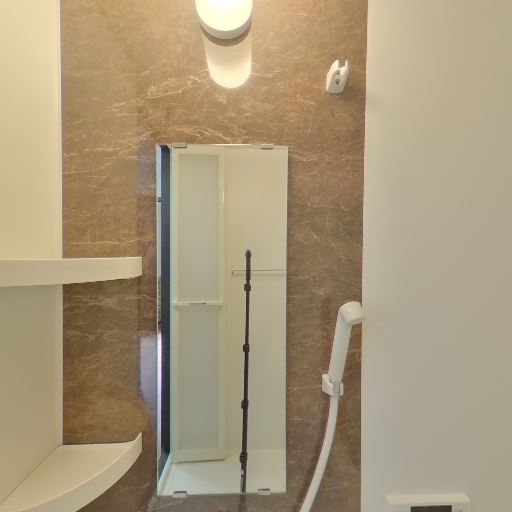 浴室の新しさ・清潔感(確度80%):壁や浴槽、鏡・シャワーなどがきれいで劣化が少なく見える。