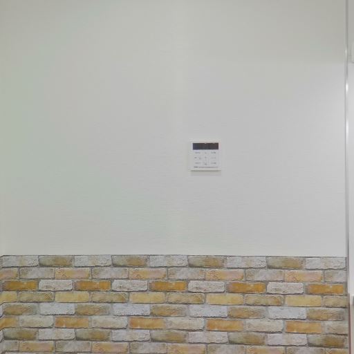 アクセントクロスのデザイン(確度86%):壁の下半分がレンガ調のアクセントクロスで統一。上部は白でコントラストがある。