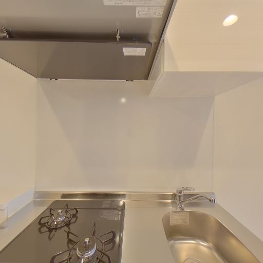 コンパクトなシステムキッチン(確度86%):2口ガスコンロとシンク、上部レンジフードがある直線型のキッチン。