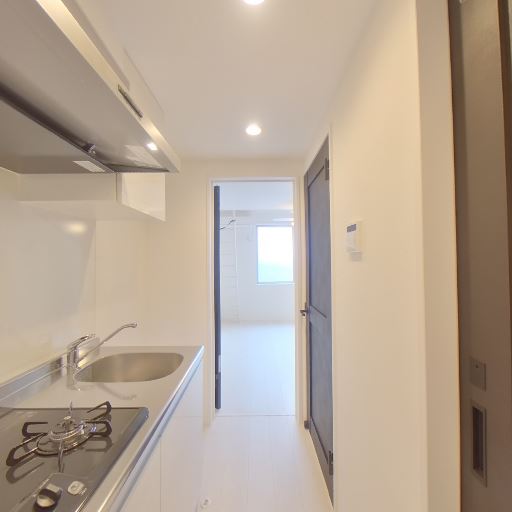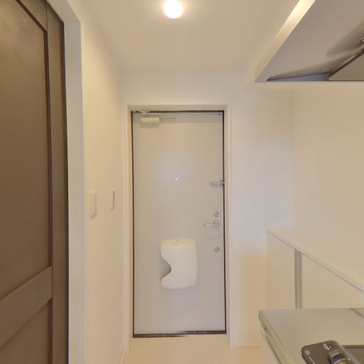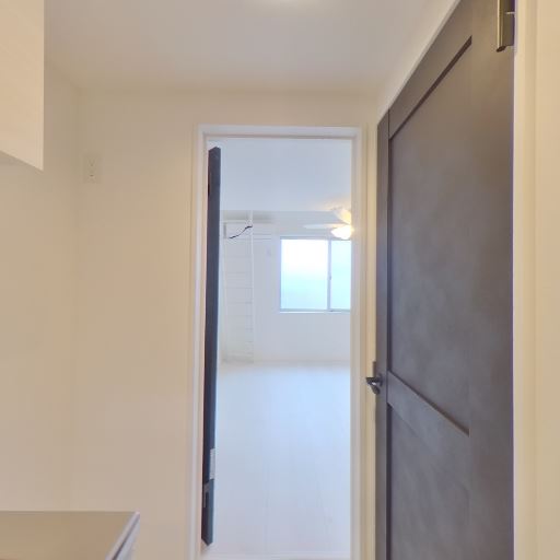 玄関が近いレイアウト(確度78%):キッチンのすぐ先に玄関ドアが見える狭廊下型の配置。