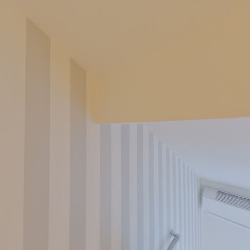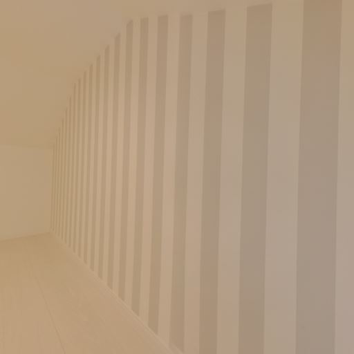 内装デザイン(ストライプ壁)(確度83%):一面が縦ストライプのアクセント壁で明るい雰囲気。