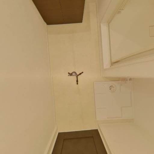 室内洗濯機置き場(確度88%):防水パンと給水・排水金具が床側に確認できる。