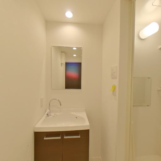 独立洗面台と収納(確度86%):鏡付きの独立洗面台が設置され、洗面下部に収納扉がある。