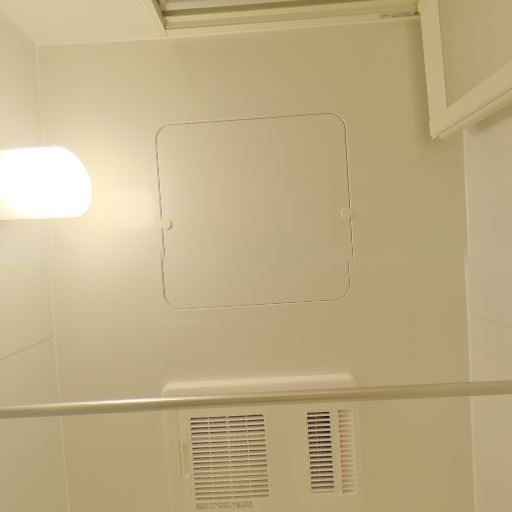 浴室乾燥・換気設備あり(確度73%):天井に換気グリルと点検口、物干しポールがあり、浴室乾燥や室内干しに対応していそう。