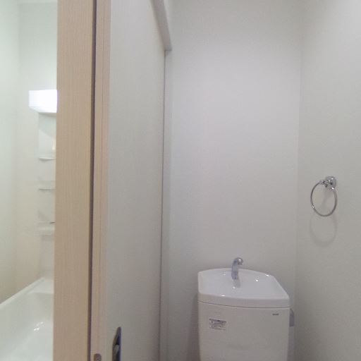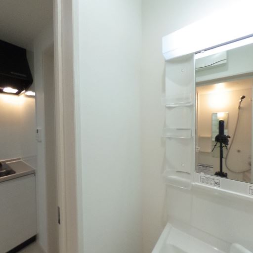 浴室と洗面台は比較的新しく清潔感がある(確度83%):洗面化粧台の樹脂棚や鏡まわり、浴室パネル・水栓まわりに大きな劣化や汚れは目立たず、白基調で清潔感がある。