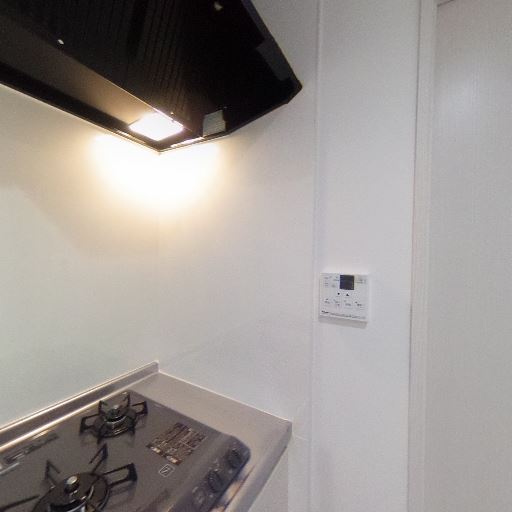 レンジフードとキッチン照明あり(確度92%):コンロ上部にレンジフードがあり、手元を照らす照明も確認できるため、換気と作業性に配慮されている。