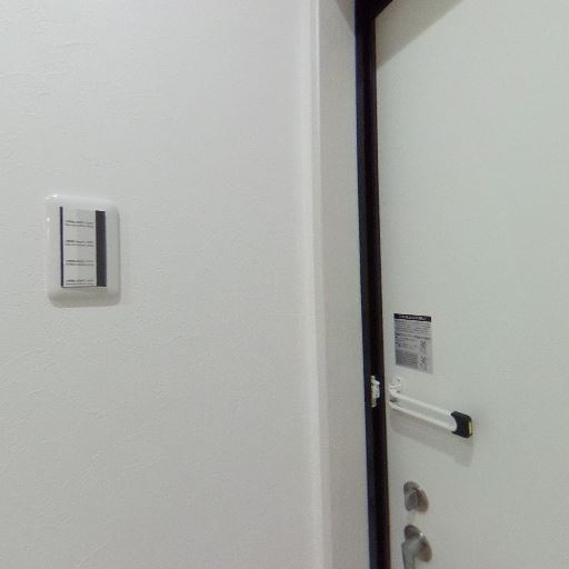 玄関ドアに防犯設備が見える(確度72%):玄関ドアにドアクローザーや内側バー状の補助金具が見え、最低限の防犯・安全設備が備わっているように見える。