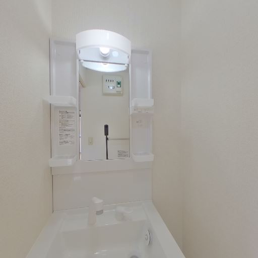 独立洗面台あり(確度90%):鏡・照明・左右に収納棚が付いた独立洗面台が設置されている。