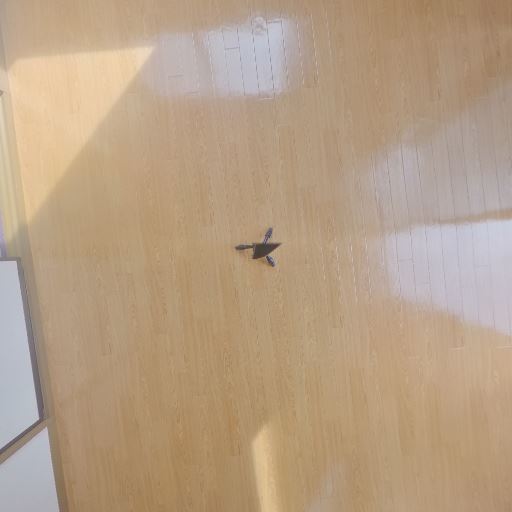床の状態(確度70%):フローリングは全体的に艶があり、目立つ傷や汚れは見当たらない。中央に撮影用の小物が置かれている。