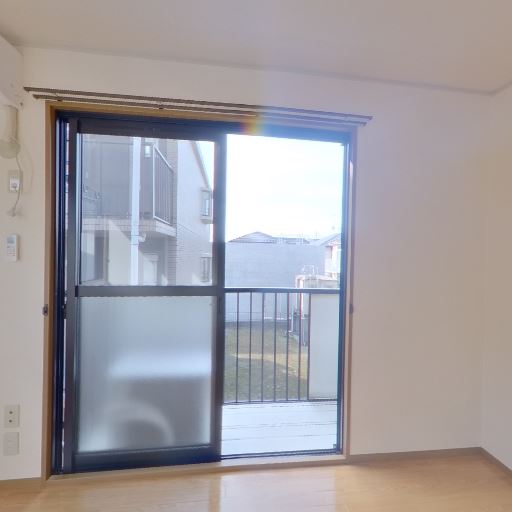 バルコニー・外部接続(確度84%):掃き出し窓の先に手すりが見え、バルコニーへ出られる。