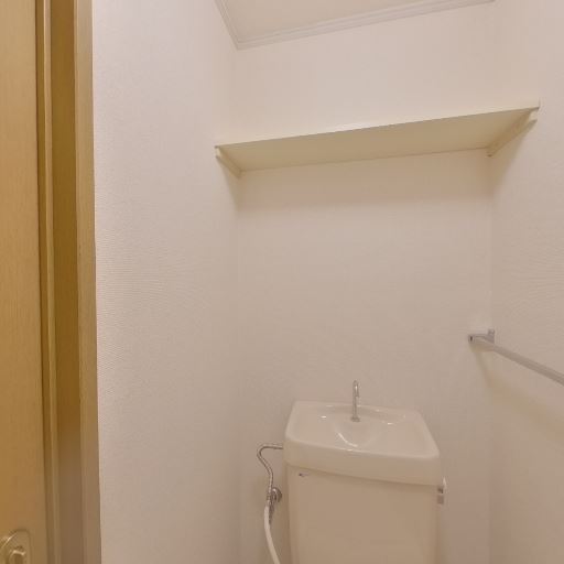 収納棚とタオル掛けあり(確度88%):便器上に奥行き浅めの棚、側面にタオルバーが設置されている。