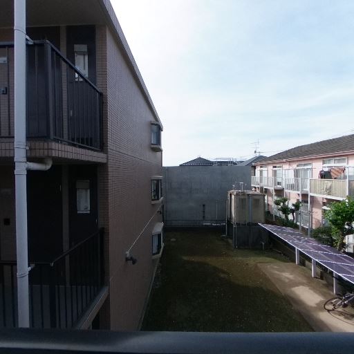 眺望・抜け感(確度63%):目の前は隣接する建物や駐車スペースだが、正面は低層で空が開けており圧迫感は比較的少ない。