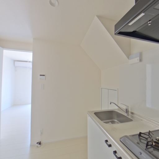 • キッチンの設備(確度86%):2口ガスコンロ、レンジフード、シンクがコンパクトにまとまったキッチン。作業スペースはやや狭め。
