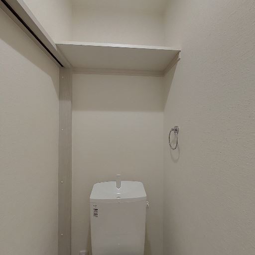 トイレ上部に棚があり収納に使えそう(確度94%):便器上の奥まった位置に固定棚が設けられており、トイレットペーパーや清掃用品の置き場として使える構造に見える。