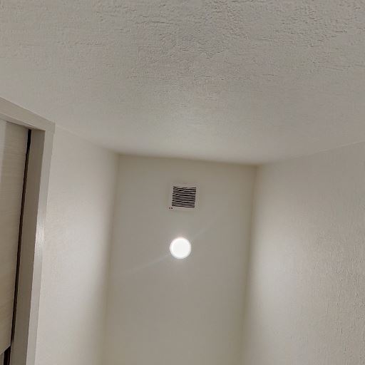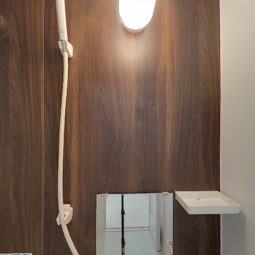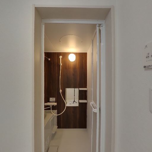 浴室が独立していて設備も見やすい(確度86%):右画像の開口部の先に独立した浴室があり、シャワー・壁面パネル・照明が確認できる。洗面脱衣所と浴室が分かれている構成に見える。
