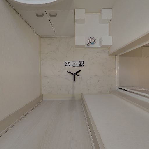 室内洗濯機置き場がある(確度96%):床面に洗濯機用と見られる防水パンと給排水設備が確認できる。屋内に洗濯機を置ける構成と判断できる。
