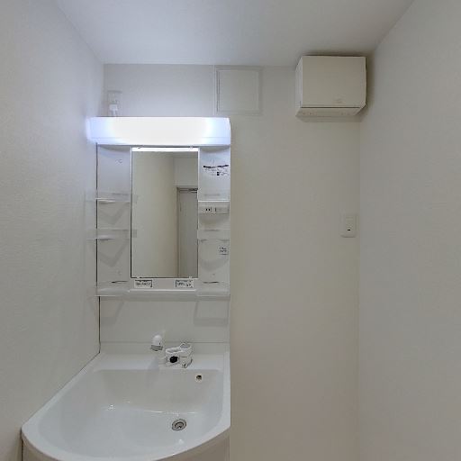 換気設備があり湿気対策に配慮されている(確度74%):洗面台上部の壁面に換気用と思われる設備が見え、洗面脱衣所の湿気やにおい対策が考慮されている可能性が高い。