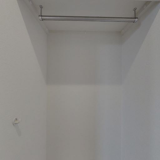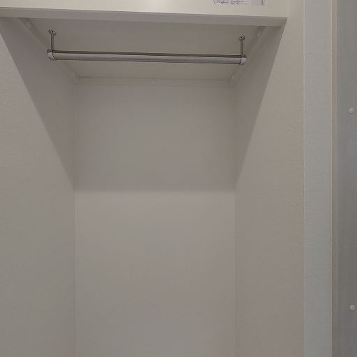 収納スペースとして使いやすいオープンクローゼット(確度94%):奥行きのある収納空間にハンガーパイプと上部棚が設置されており、衣類を掛けつつ上段に小物や箱物を置ける構成に見える。
