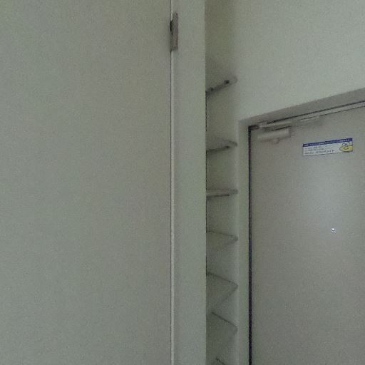 • 共用廊下(屋内通路)の可能性(確度90%):玄関扉が並び、非常口サインや消火器が見えるため、住戸内ではなく建物の共用部と推測される。
