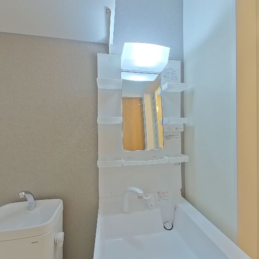 • 独立洗面台があり使いやすそう(確度94%):鏡付きの洗面化粧台が設置されており、身支度用の棚も付いている。