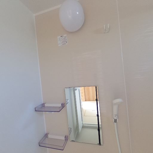 浴室が近接(確度82%):洗面室から直結する浴室が見える。折れ戸と手元シャワー、鏡・棚が確認できる。