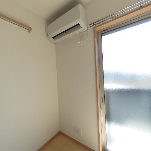 エアコン設置済み(確度90%):壁上部に室内機が設置済みで、床には室外機が仮置きされている。空調の用意が整っている。