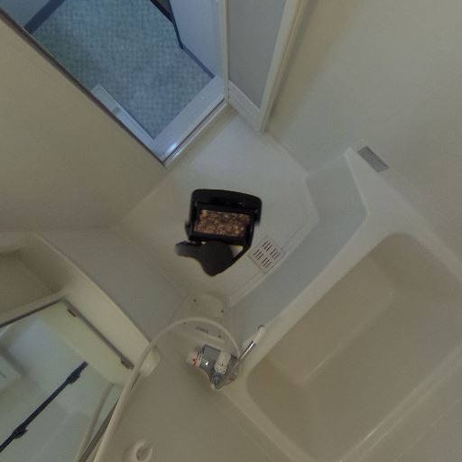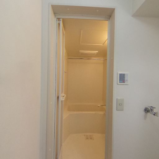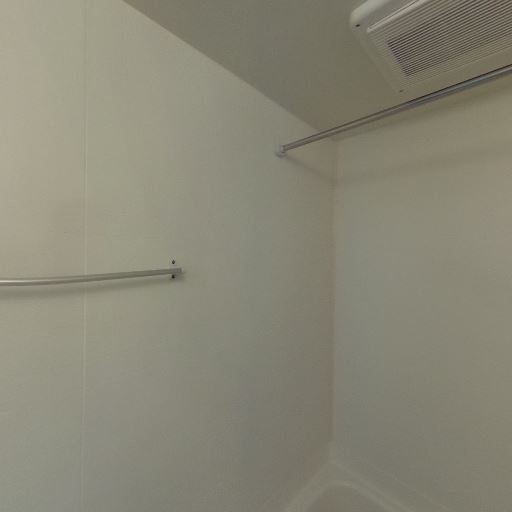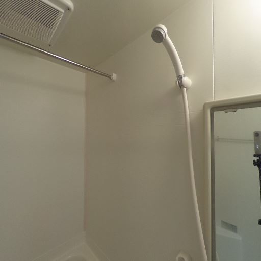 浴室乾燥・換気設備がありそう(確度92%):天井付近に換気乾燥機らしき設備が見え、浴室内には物干しバーも設置されている。浴室内干しに対応しやすい構成と考えられる。
