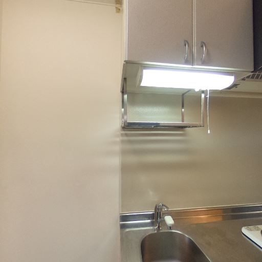 ミニキッチン付きで最低限の自炊は可能(確度88%):細長い通路側にシンクと上部収納を備えたコンパクトなキッチンが設置されている。