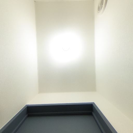 換気設備がある(確度90%):壁上部から天井付近に換気口が確認でき、トイレ空間の換気に配慮されていると見られる。