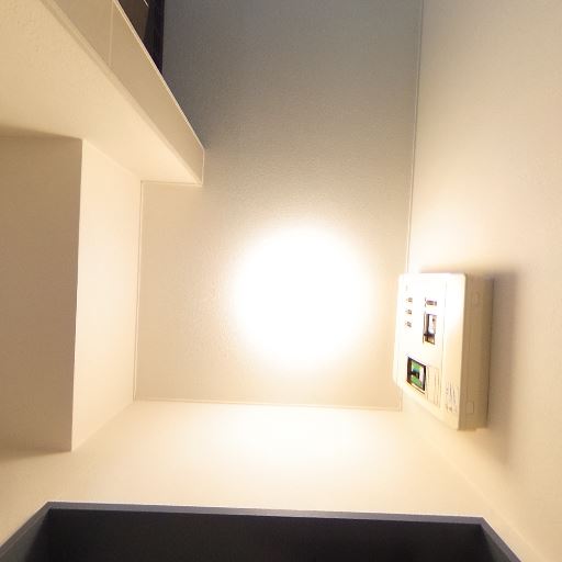 天井照明と換気・設備操作パネルが近くにまとまっている(確度70%):天井には照明があり、壁上部付近に設備操作用と思われるパネルが設置されている。玄関・廊下まわりの基本設備は整っていると見られる。