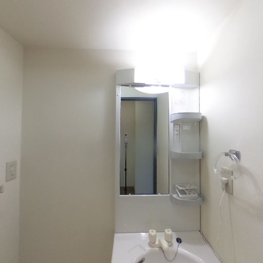 洗面台に収納と鏡があり身支度しやすい(確度90%):洗面台正面にミラーキャビネットと小物置きが見え、洗面まわりの機能は一通り揃っている。