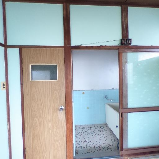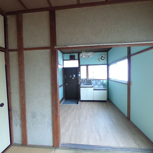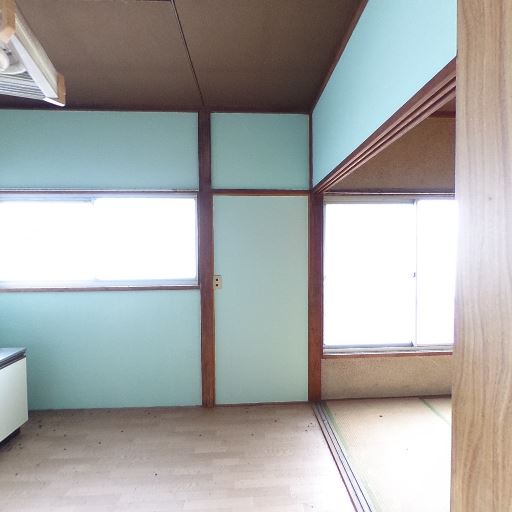 和室とキッチンが隣接する昭和レトロな間取り(確度78%):畳の部屋とキッチンが引き戸か開口でつながっており、木枠と水色の壁面が特徴的。
