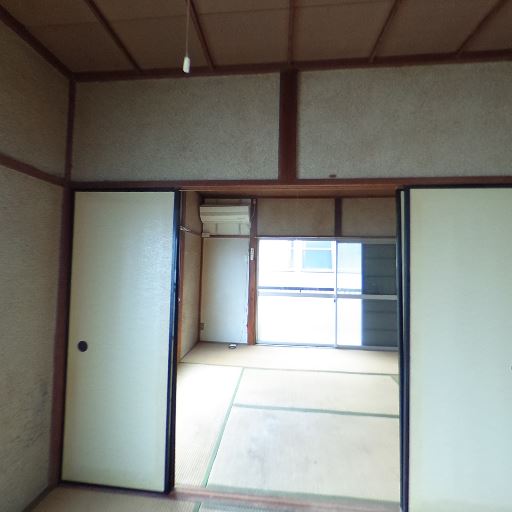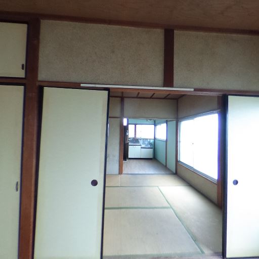和室の間取りと続き間(確度82%):畳敷きの和室で、襖の先にもう一室と台所が続いて見える。