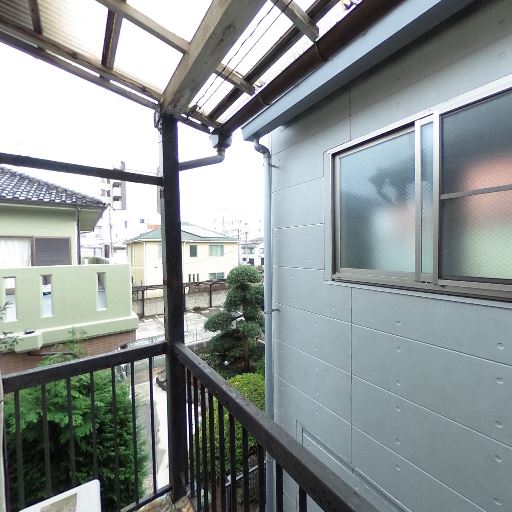 屋根付きで雨天でも使いやすい(確度90%):バルコニー上部にポリカ波板と梁の屋根があり、全面を覆っている。