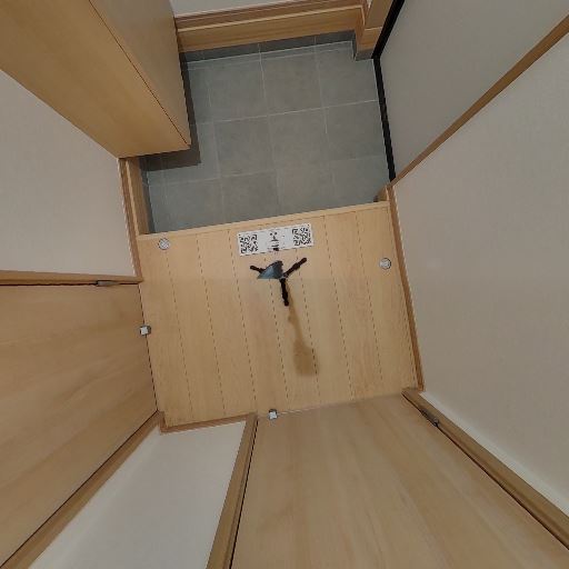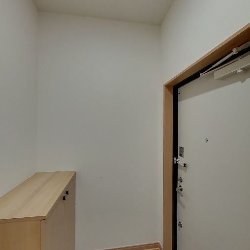 玄関スペースと収納(確度80%):玄関ドアの内側とシューズボックスが見える。通路幅はややタイトだが、靴収納は十分ありそう。