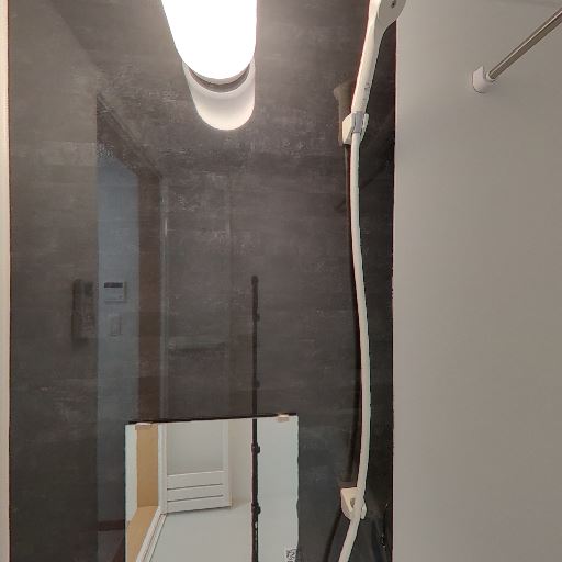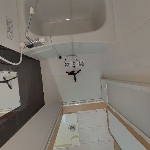 浴室であること(確度98%):浴槽・シャワー・鏡・浴室照明・天井換気扇が確認できる。脱衣所/洗面台に面している。