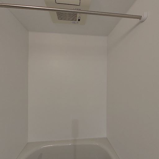 浴室乾燥・換気設備(確度90%):天井に換気扇パネルがあり、物干しポールも設置されている。
