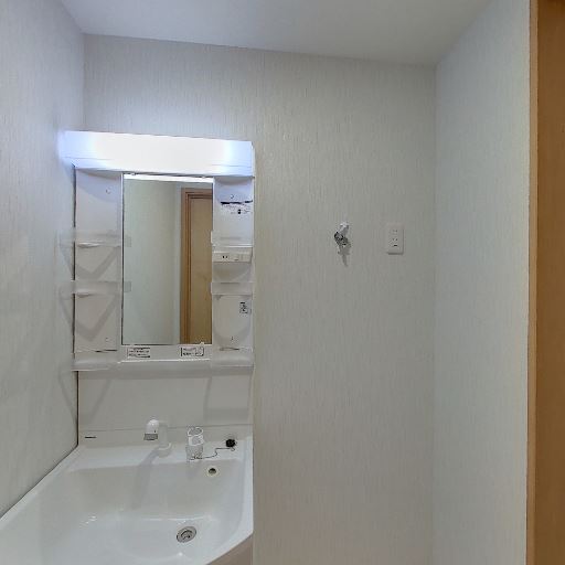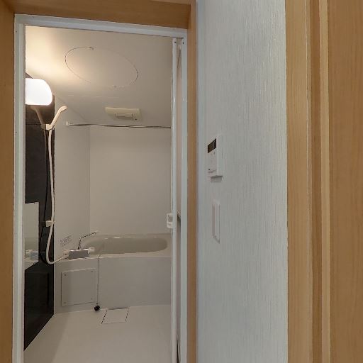 浴室が隣接(確度90%):洗面室から直接入れる浴室が見える。浴槽・シャワー・換気設備が確認できる。