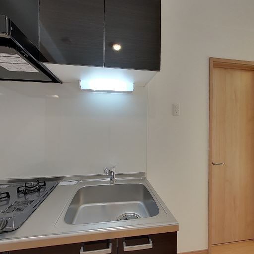 キッチン設備の新しさ(確度82%):ガスコンロ・レンジフード・シンクが比較的新しく清潔に見える。ツヤのあるパネルで油はねの掃除もしやすそう。