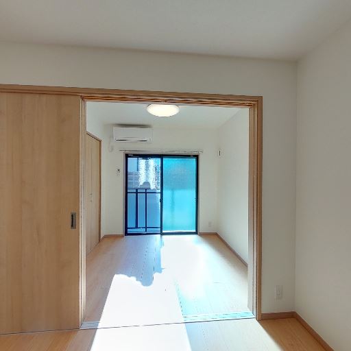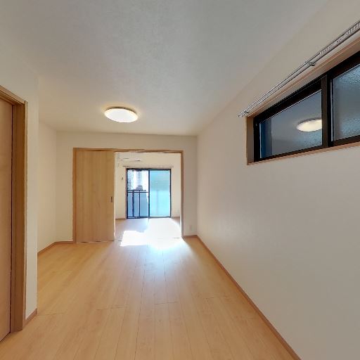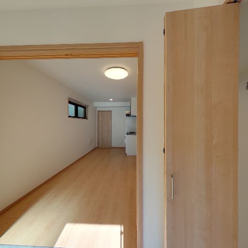 居室とキッチンのつながり(確度77%):引き戸の先に縦長のLDK空間が続いており、奥にキッチンと収納扉が見える。