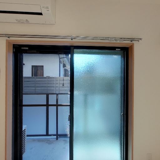 バルコニー面の掃き出し窓(確度86%):大きめの引き違い窓があり、右側ガラスは型板で視線を遮る。屋外に手すり・室外機が見え、バルコニーが存在。