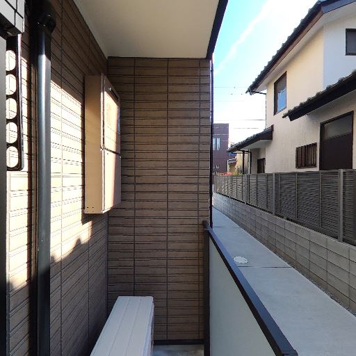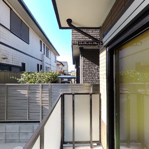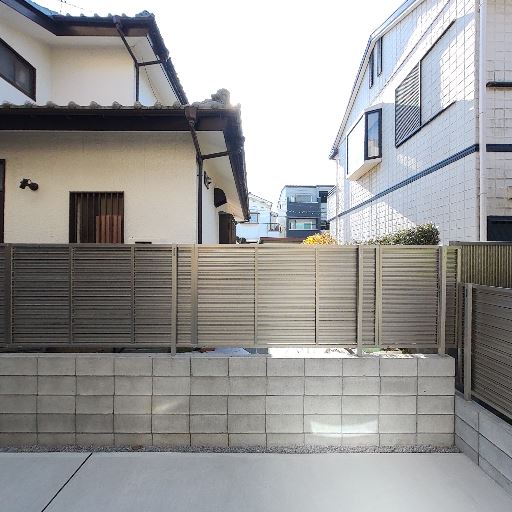 視線配慮された1階バルコニー(確度78%):腰高の目隠しフェンスとブロック塀で囲われ、道路や隣家からの直接の視線が入りにくい。