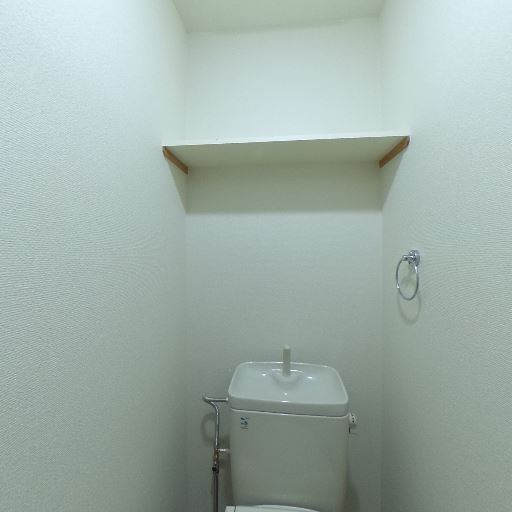 上部収納棚がある(確度94%):便器上の壁面に棚板が設置されており、トイレットペーパーや掃除用品などを置ける収納スペースがある。